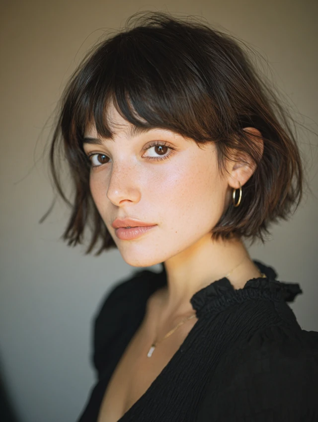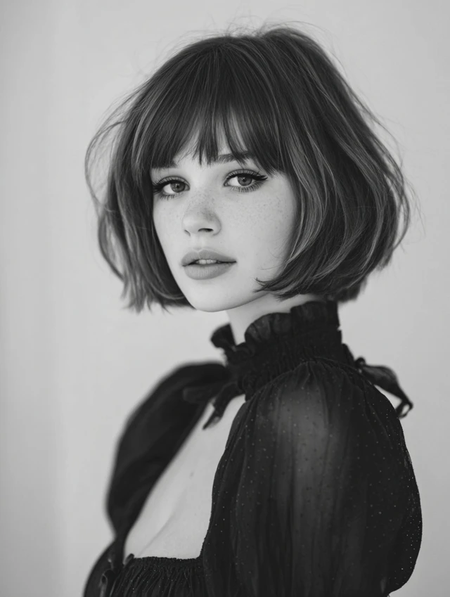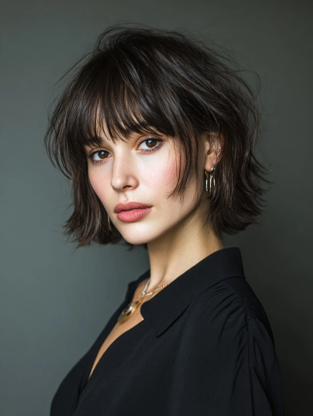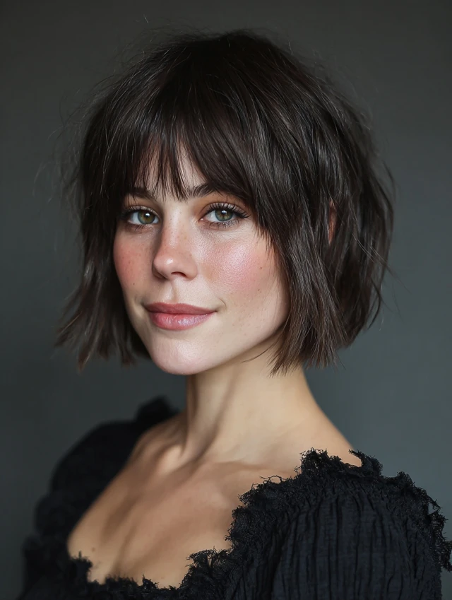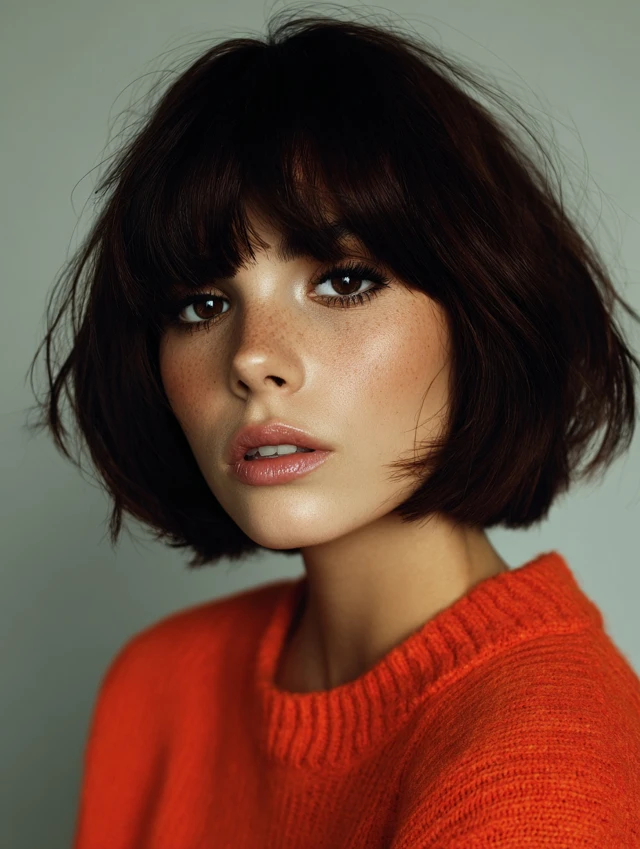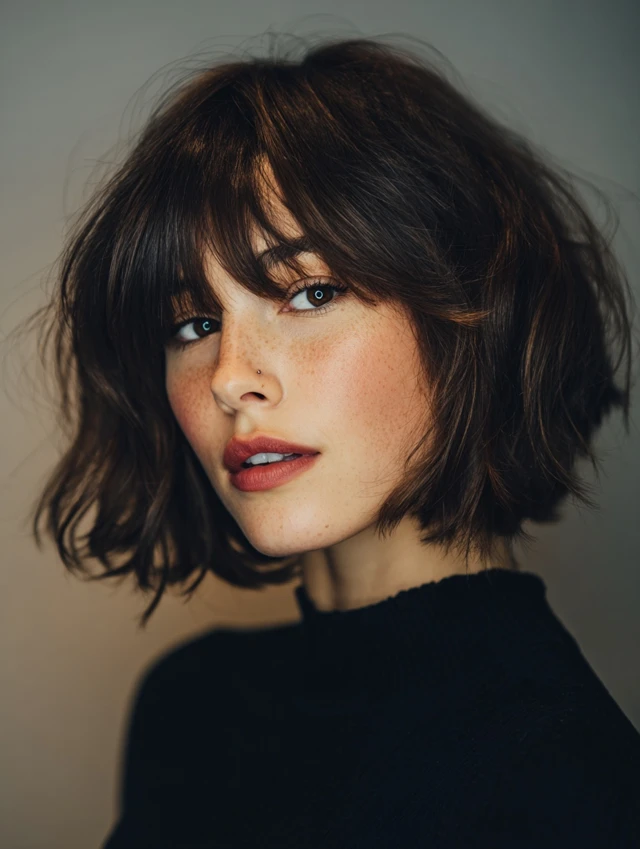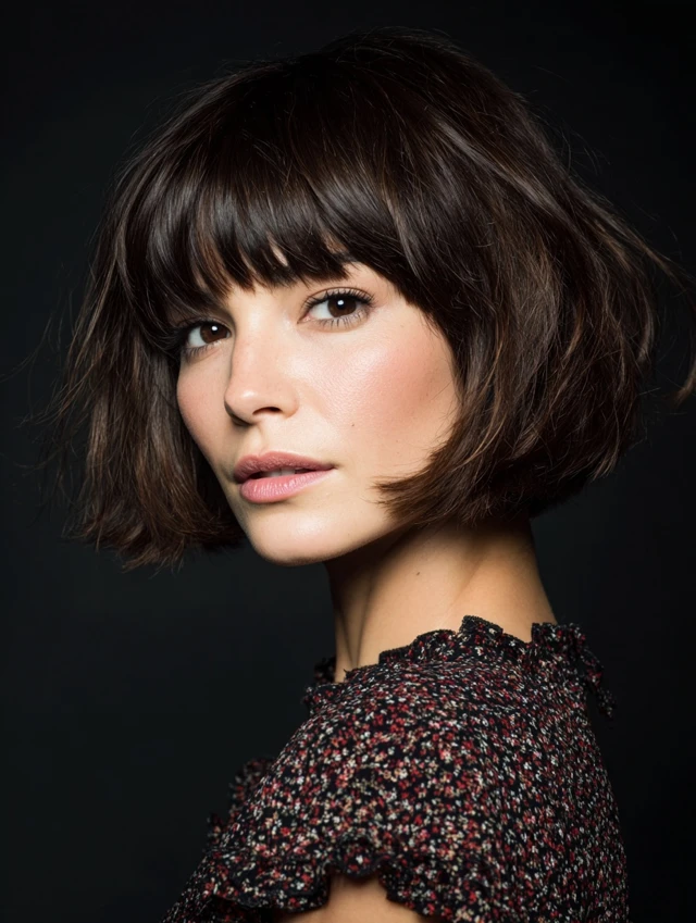 The bob adds shape, while bangs introduce softness.