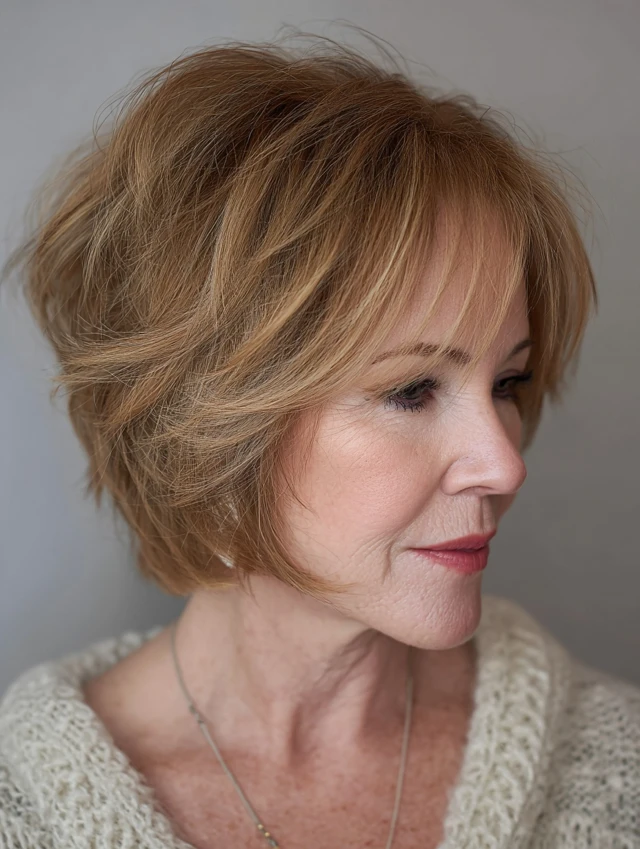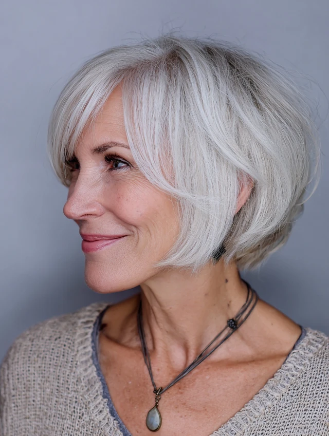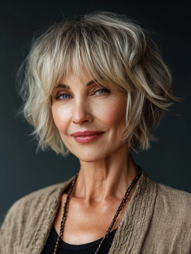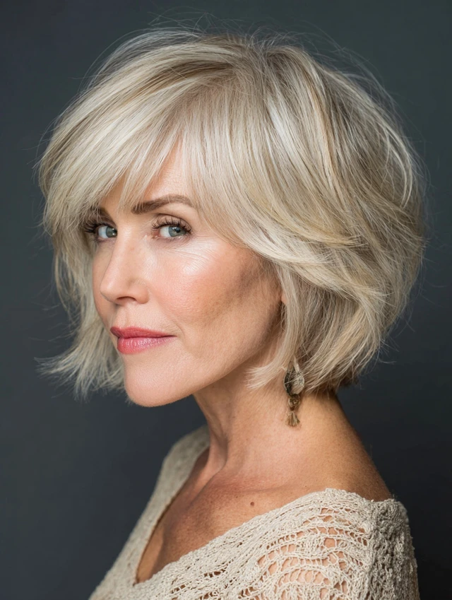 A bob with bangs over 50 offers the perfect blend of elegance and modern style. Whether you prefer wispy bangs, curtain bangs, or side-swept fringe, this hairstyle enhances facial features while keeping your look fresh and sophisticated.