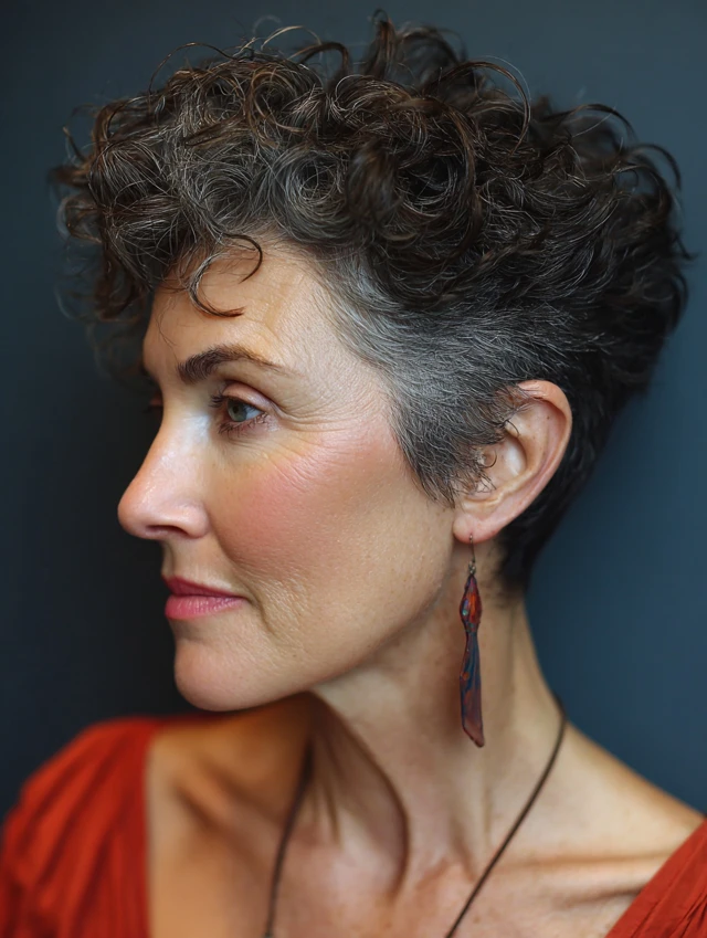 A curly pixie cut adds personality while keeping styling quick and simple.